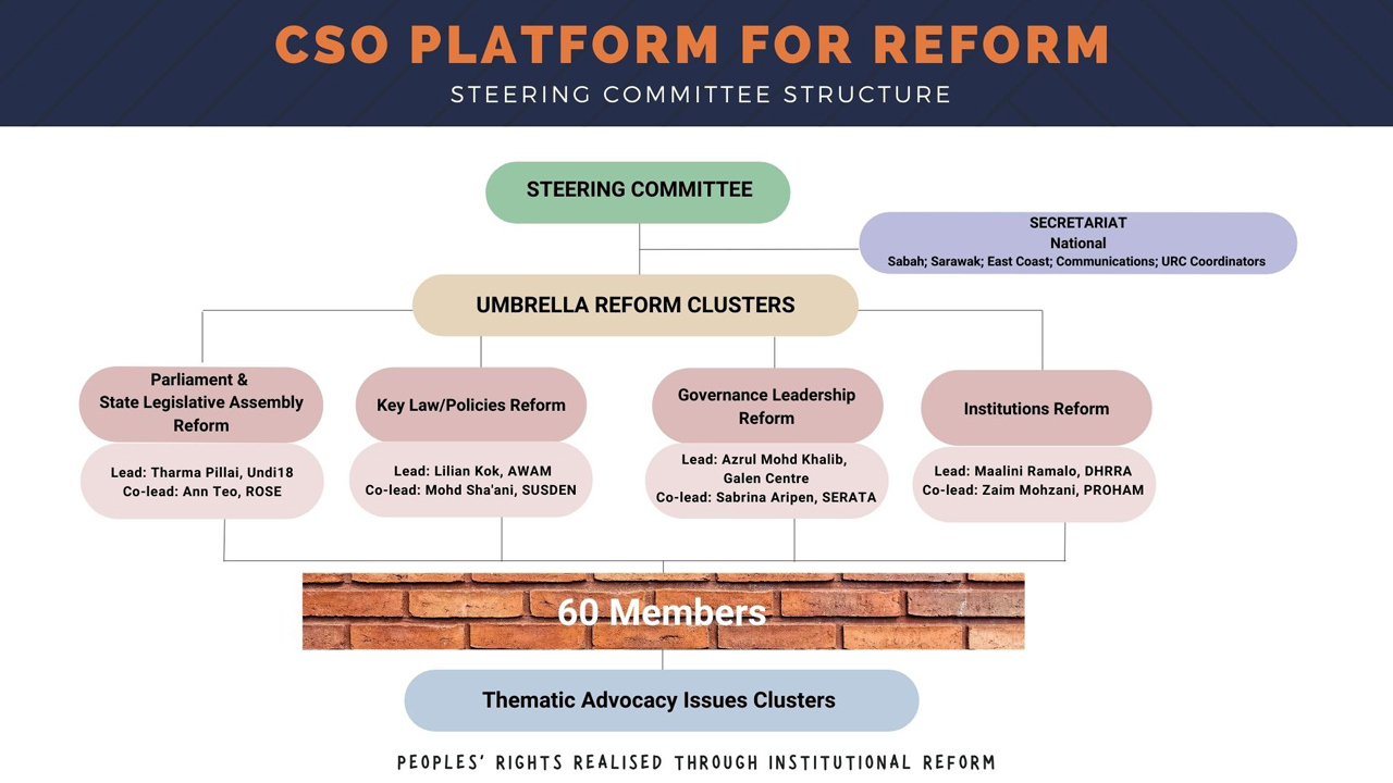 In May 2018, the Pakatan Harapan government came into power in Malaysia with a new mandate for institutional reform. Pusat KOMAS, a civil society organisation, initiated the formation of the CSO Platform for Reform (CSO Platform) to enable Malaysian NGOs to contribute strategic proposals for reform to the Institutional Reform Committee. The CSO Platform was established as a group of like-minded NGOs that were organised into thematic clusters based on their areas of specialisation in reform. The aim was to build better working relationships with the respective ministries and empower CSOs to support the government's efforts toward institutional reform.